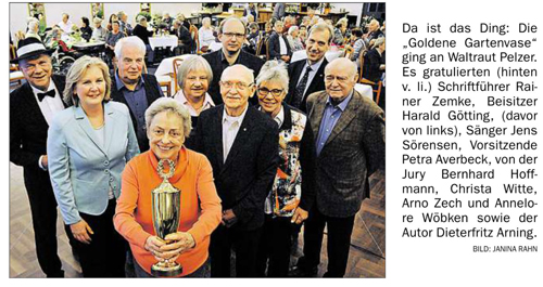 EVERSTEN - Die Vorarbeit lag in vielen Händen. Und am Ende haben auch alle was davon. Um ein attraktives Wohnumfeld geht es letztlich, wenn die Oldenburger Bürgervereine schöne Vorgärten prämieren. Der Bürgerverein Eversten macht das alljährlich auf eine besondere Weise. Denn er beschenkt die ausgezeichneten Gartenbesitzer nicht nur mit Blumen. Für den aller-, aller-, allerschönsten Vorgarten gibt es auch noch die „Goldene Gartenvase“. In diesem Jahr wurde sie an Waltraut Pelzer überreicht – ganz feierlich am vergangenen Samstag im Stadthotel Eversten im Kreise von rund 70 Gästen. Es war eine wirklich runde Sache. Und das lag nicht nur daran, dass der Wanderpokal zum 40. Mal vergeben wurde.