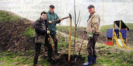 Bäume und Sträucher wurden nicht nur von der Stadt (als Ausgleich für neue Versiegelungen im Baugebiet) auf den Spielplatz gepflanzt, auch der Bürgerverein Eversten half mit. Er spendete der Stadt zwei Apfelbäume der Sorten "Cox orange" und "James Grieve". Die halbstämmigen Bäume pflanzten der Vereinsvorsitzende Hans-Günther Zemke und Schatzmeister Werner Renken zusammen mit dem Gartenbau-Ingenieur Horst Fischer. Wir freuen uns, wenn die Kinder schon in den nächsten Jahren saftige, knackige und aromatische Äpfel wachsen sehen und danach ernten können", so Hans-Günther Zemke.